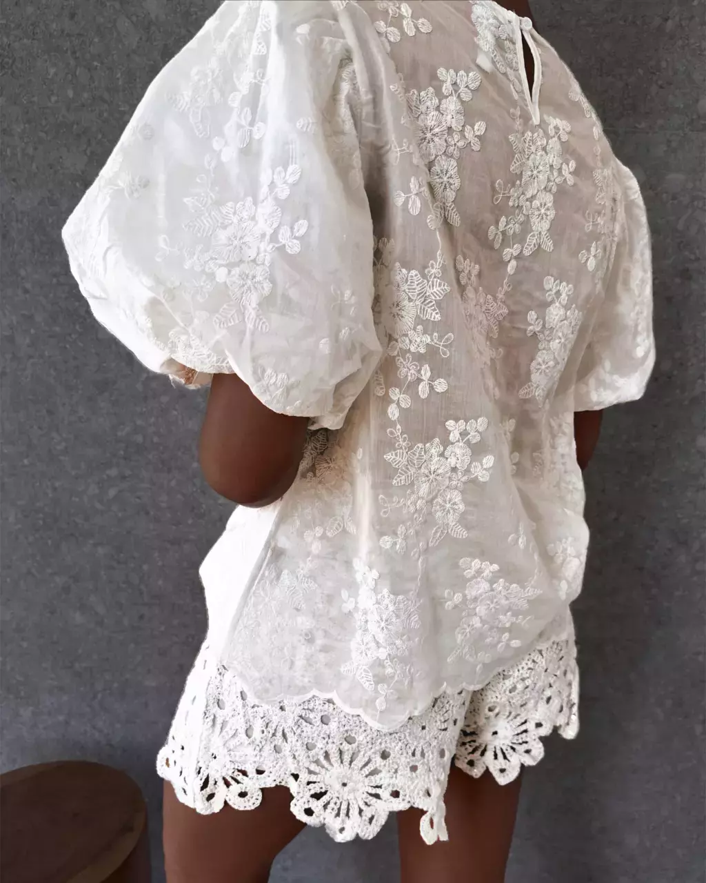 BLUSA 80% TENCEL, 15% POLIESTER, 5% ALGODON. DETALLE DE PUNTILLA EN FRENTE. MANGA GLOBO CON PUÑO ELASTICO.
